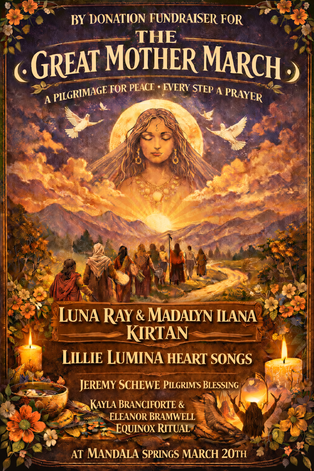 Luna Ray, Madyln Ilana, Lillie Lumina, Jeremy Schewe, Kayla Branciforte, and Eleanor Bramwell will weave music, blessings, and ritual this spring equinox in honor of the Great Mother March.