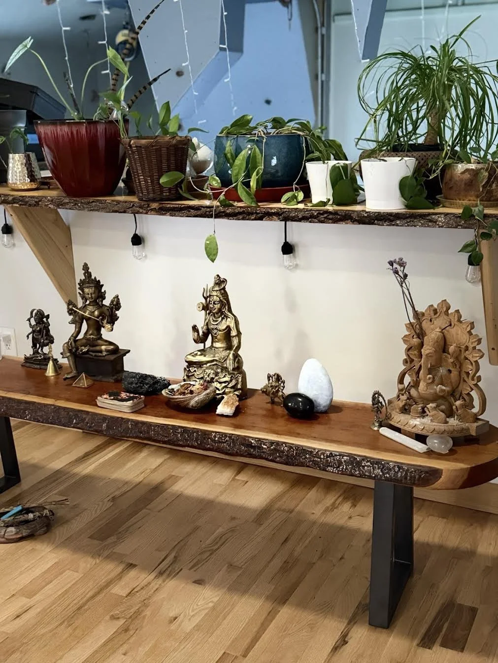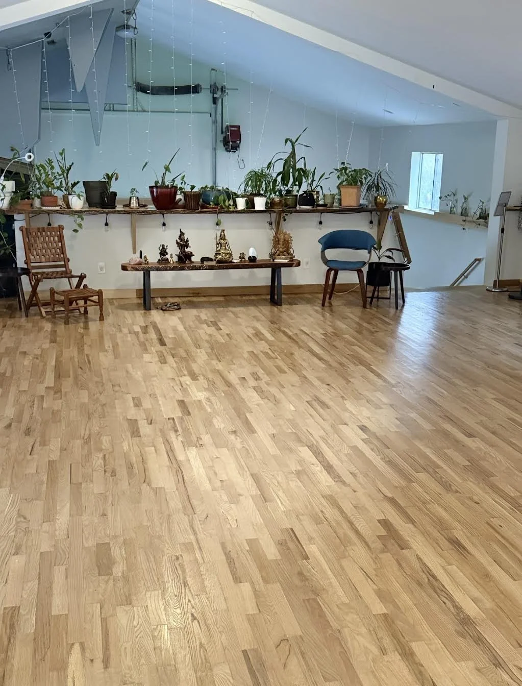 Our 1,400 sq event space has red cedar floor, gentle lighting and stunning plants. It is equipped with a state of the art sound system, a projector, yoga props, and meditation cushions.