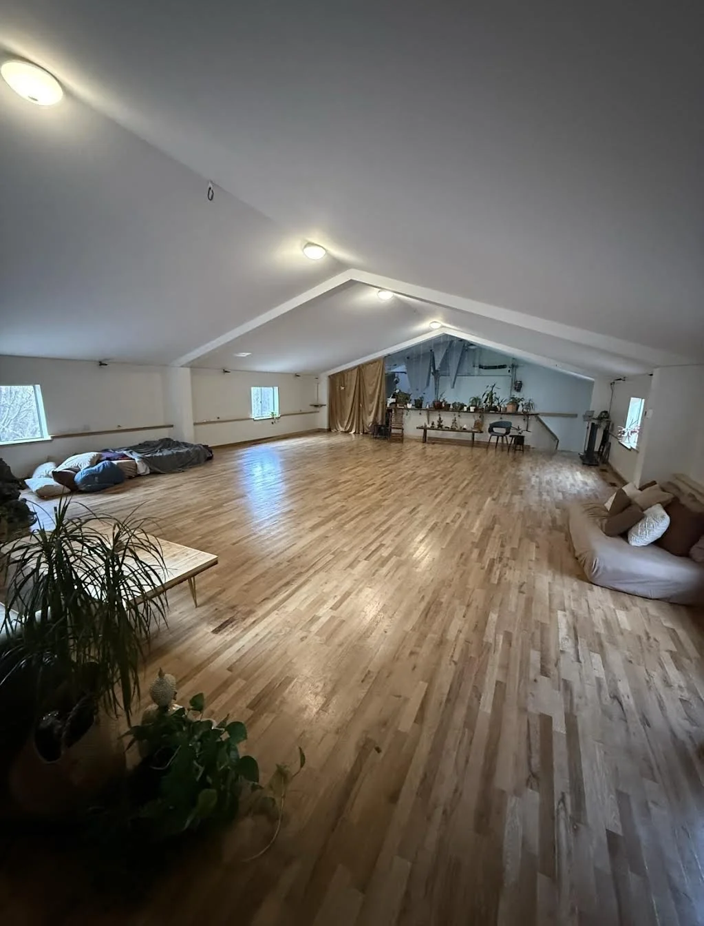 The Event Space: Our stunning 1,400 sq ft event space is equipped with a red oak sprung floor, ideal for movement-based activities like yoga, dance, and meditation. The open, airy design and large windows invite natural light and provide breathtaking views of the surrounding forest, creating a tranquil atmosphere for reflection and connection. The sprung floor adds extra comfort for extended movement sessions, making it an ideal venue for both intimate and larger gatherings.